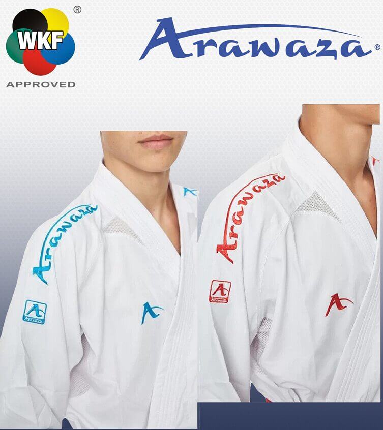 Le Kimono Arawaza Kumite Deluxe Evo Première League rouge/bleu est approuvé par la WKF, de plus, il y a une broderie sur l’épaule selon les spécifications de la WKF, rouge ou bleu.