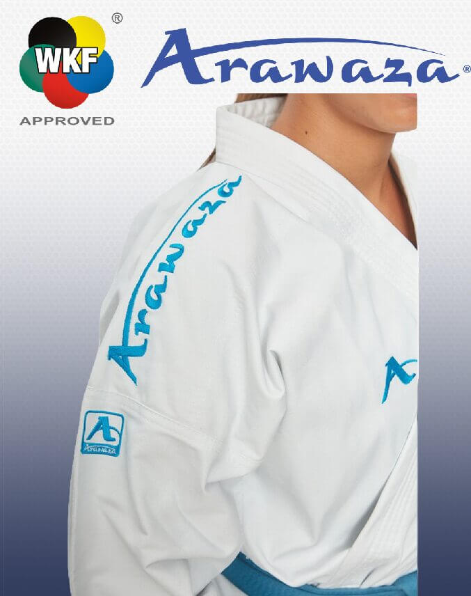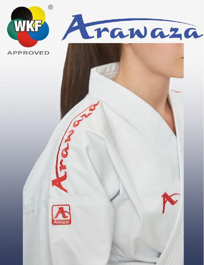 Le Kimono Arawaza Kata Deluxe Evo Première League WKF approved est un kimono avec une broderie sur l’épaule selon les spécifications de la WKF, rouge ou bleu.
