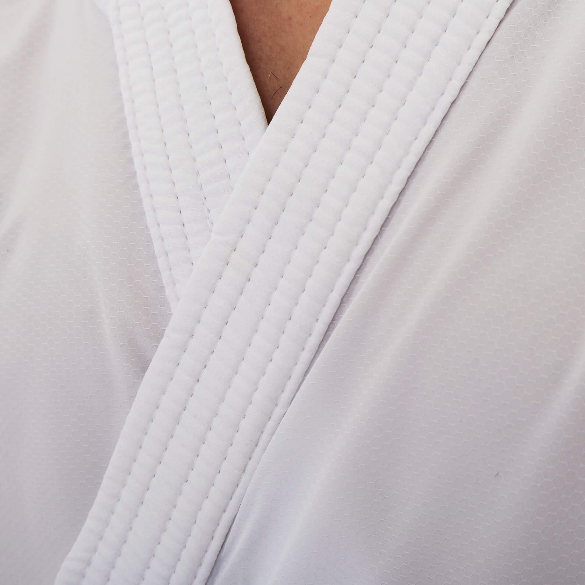 Fabriqué à partir d’un tissu ultra-léger de 100 % polyester (6 oz, environ 170 g), le Kimono kumité Inazuma Pack SMAI est conçu pour être incroyablement léger tout en offrant une robustesse et une longévité exceptionnelles. Le tissu est doté de la technologie “zéro traînée”, ce qui permet d’éviter que le kimono ne colle à la peau pendant l’effort, assurant ainsi un confort constant même en cas de transpiration. Son design unique, composé de tissus à nid d’abeille et à carreaux, garantit une excellente ventilation et respirabilité, réduisant la chaleur et l’humidité, tout en maintenant une grande résistance à l’usure. Ces caractéristiques font du kimono un excellent choix pour les athlètes qui recherchent des vêtements à la fois légers et performants.