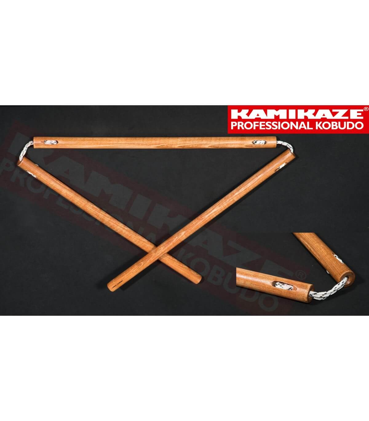 SANSETSUKON Kamikaze Professionnel Kobudo, triple corde, fabriqué en Europe, en bois de chêne. Le bois est traité avec un vernis protecteur et protecteur qui ne laisse pas de film sur le bois.